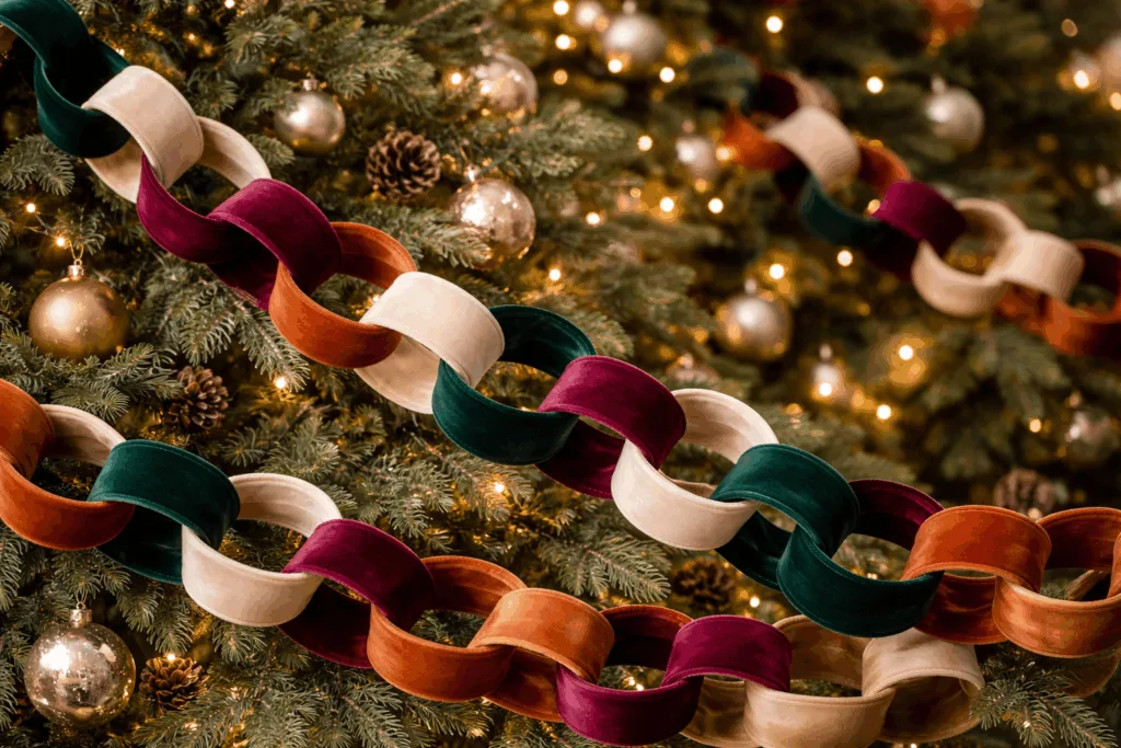 З часом паперові ланцюги закріпилися як “дитячий” декор і поступово зникли з дорослих інтер’єрів. Сьогодні ж ідея повертається, але замість паперу використовують стрічки — оксамитові, тканинні або щільні декоративні. Така гірлянда виглядає стримано, трохи ностальгійно і дуже естетично. Її легко зробити разом, а ще вона добре працює в кадрі: на фото й у відео.
